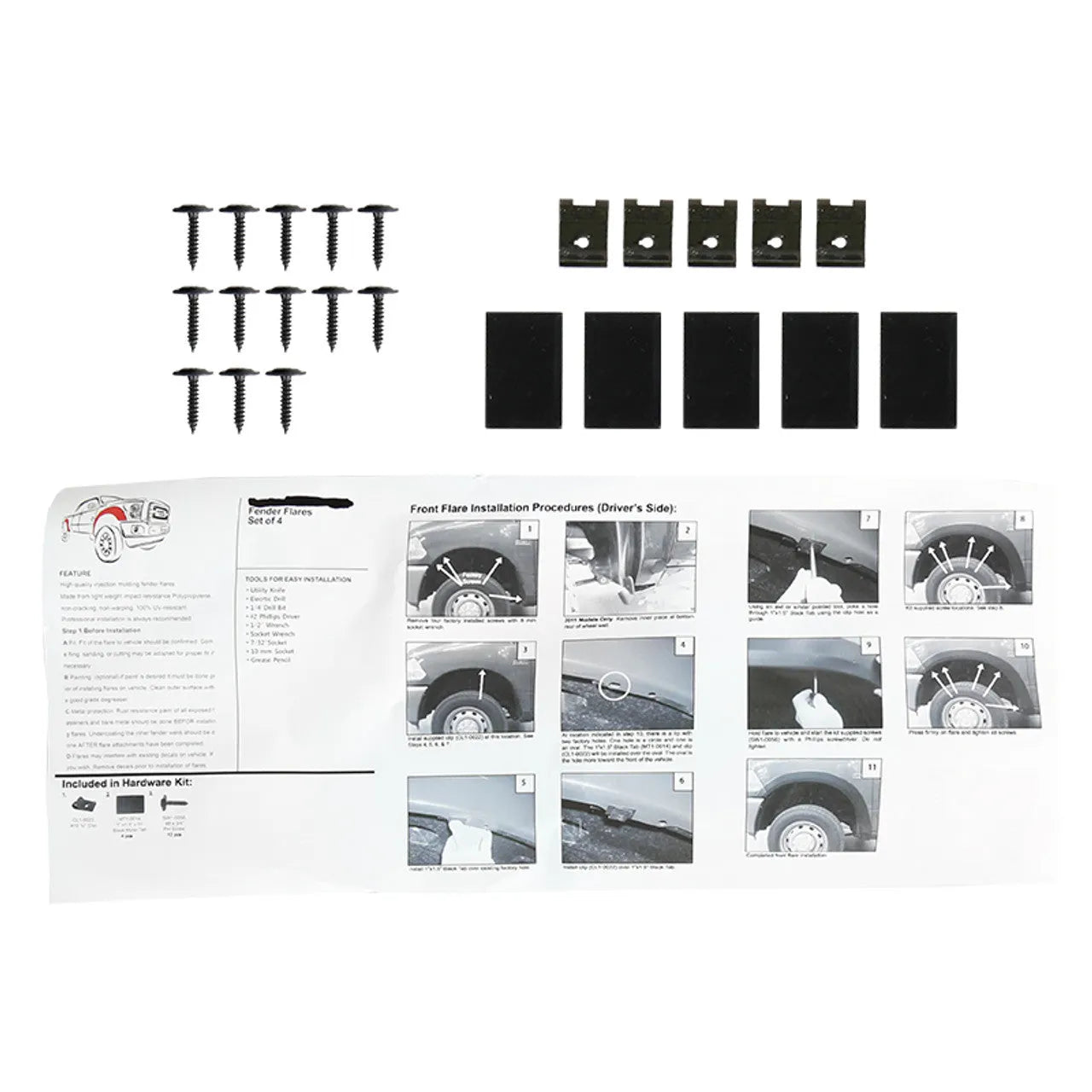 Installation is straightforward with all necessary hardware included. The fender flares are designed for a bolt-on fit with no cutting or trimming required, making them accessible for most DIY enthusiasts. However, some drilling may be necessary to secure the flares properly. For best results and to ensure a perfect fit, professional installation is recommended.
