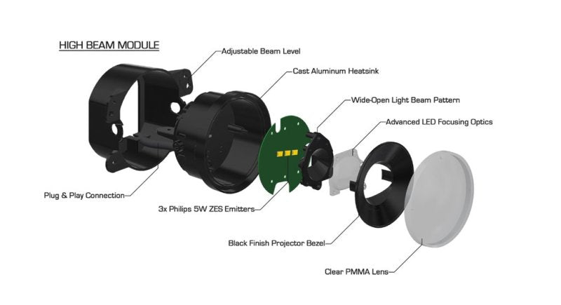 • Integrated LED Low Beam, High Beam, DRL, and Turn Signal modules