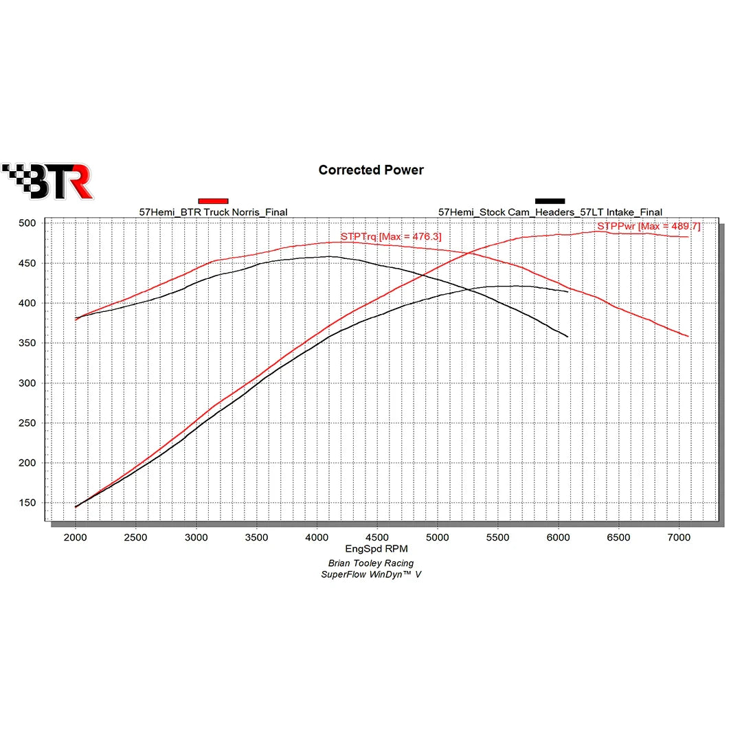 Approaching 490 HP at the crank of your 5.7L Hemi is what you can expect with our ‘Truck Norris’ camshaft. This ‘Truck Norris’ grind gives an additional 1500 RPM of usable operating range while maintaining drivability. On the BTR Dyno, we saw gains over the factory cam everywhere above the 2000 RPM start point. At 6000 RPM, a gain of 71 HP and 62 lb/ft. The ‘Truck Norris’ continues to pull strong to 7000 RPM!