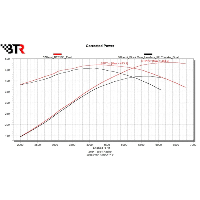 Brian Tooley Racing develops the Stage 1 camshaft with meticulous attention to detail, crafting the cam lobes in-house to achieve an optimal balance between aggressive performance and engine stability. The camshaft undergoes rigorous spintron and dyno testing to ensure durability and consistent power gains. The design supports the high valve lift and increased RPM potential of the 5.7L HEMI, necessitating upgraded valve springs and non-MDS lifters to handle the enhanced stress.