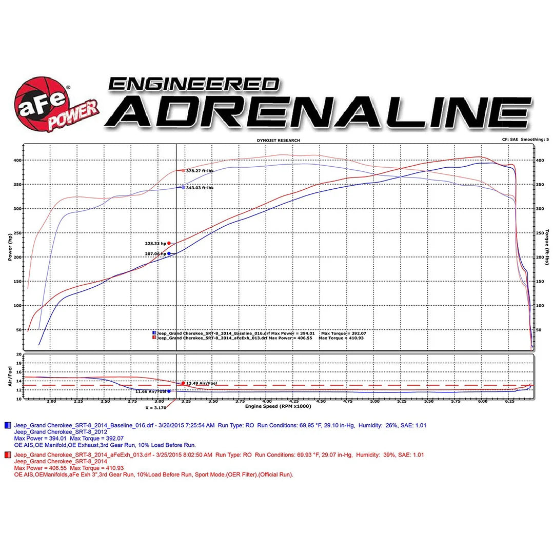 49-48053 AFE Power 12-21 Jeep Grand Cherokee 6.4L SRT Mach Force Exhaust System. The MACH Force XP cat-back exhaust system for the vehicle engine offers a max gain of +21 HP and +35lbs. x ft. of torque, as verified by our in house dyno. This exhaust system is constructed out of mandrel-bent stainless steel tubing for unrestricted flow and is MIG-welded for strength and durability.