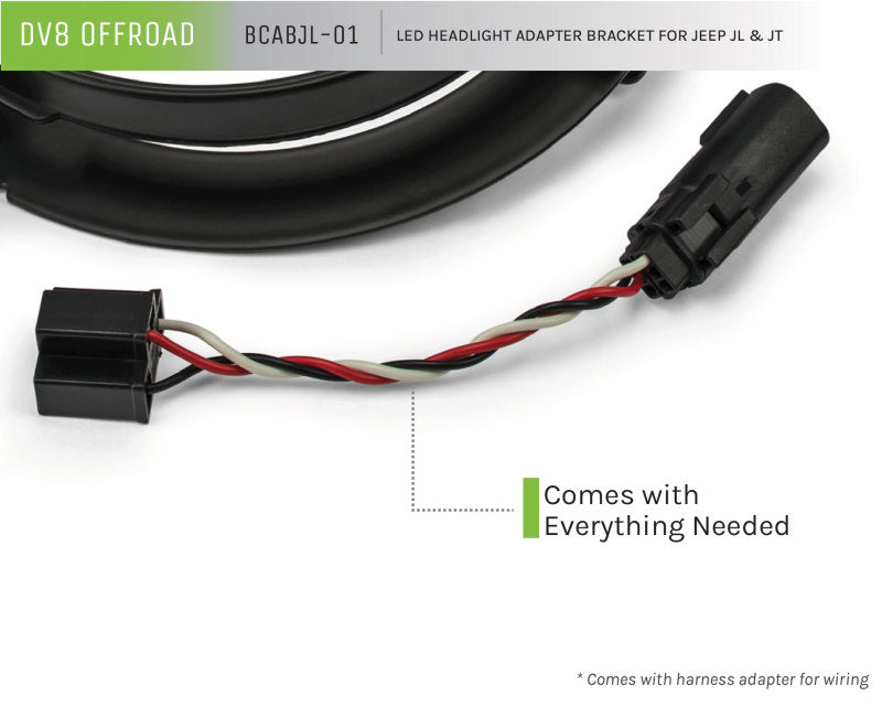 BCABJL-01 DV8 Offroad Jeep Wrangler (18-21) / Gladiator (20-21) 7in Headlights Adapter Kit. The DV8 Offroad 7in Headlights Adapter Kit enables seamless installation of 7-inch JK or TJ headlights on 2018-2021 Jeep Wrangler and 2020-2021 Jeep Gladiator models. This plug-and-play kit includes wiring harness adapters for easy integration and maintains OEM adjustability. Perfect for enthusiasts seeking to upgrade their lighting with a wide range of aftermarket options while ensuring a precise fit on their Jeep JL or Gladiator.
