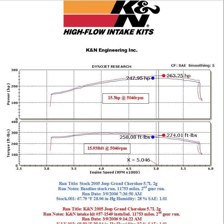 57-1549 K&N Filters 05-10 Jeep Commander / Grand Cherokee 5.7L Hemi 57 Series FIPK Cold Air Intake. The K&N® 57 Series FIPK Cold Air Intake increases horsepower and torque while enhancing throttle response and engine sound. Featuring a roto-molded HDPE intake tube, oversized washable oiled cotton filter, and heat shield, it delivers high airflow while protecting intake air from engine heat. Easy installation and No-Hassle Lifetime Limited Warranty ensure dependable performance for your vehicle.