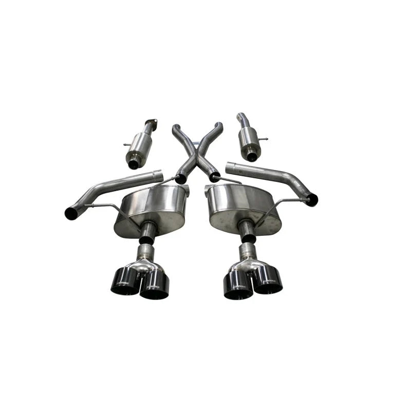 Corsa 21051BLK Sport Cat-Back Exhaust System (Black Tips) for 18-21 Jeep Grand Cherokee 6.2L Trackhawk. CORSA's patented RSC® Technology delivers a custom, drone-free exhaust sound tailored to your vehicle, offering aggressive tones under acceleration and a quiet experience while cruising, all while enhancing performance without affecting power gains.