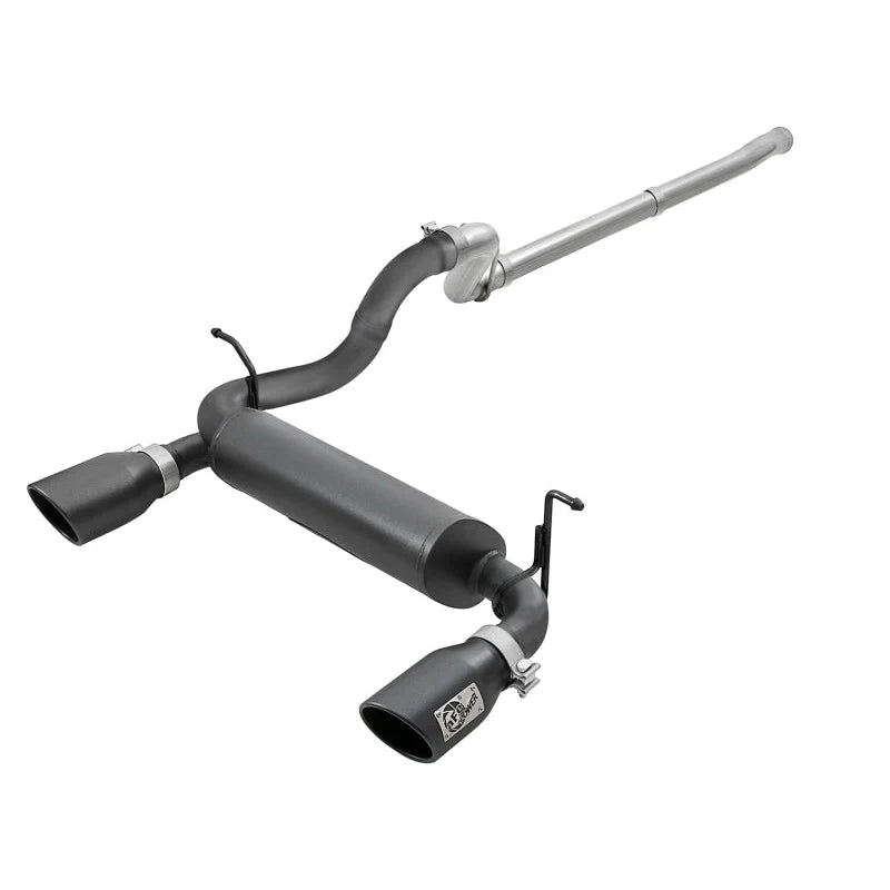 AFE 49-48076-B Rebel Series Cat-Back Exhaust System (Black Tips) for 18-25 Jeep Wrangler JL 3.6L V6. This exhaust system delivers quality, sound, performance and appearance for your Jeep. Made from mandrel bent 409 stainless steel tubing for increased exhaust flow and performance, this dual rear exit system eliminates the primary muffler and uses a high flow, transverse rear muffler, finished in high temp black powder coating so it looks as good as it sounds.