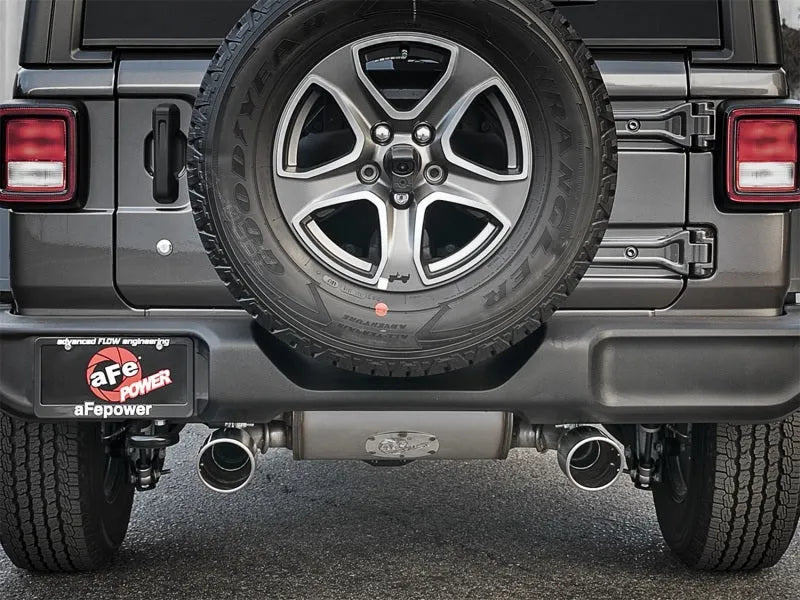 49-48066-P aFe 18-25 Jeep Wrangler 3.6L V6 Rebel Series Cat-Back Exhaust (Polished Tips). Upgrade your Jeep Wrangler with the aFe Rebel Series Cat-Back Exhaust featuring 2-1/2" mandrel bent 409 stainless steel piping and dual 4-1/2" polished stainless steel tips for a sleek, aggressive look. Dual free-flowing mufflers deliver smooth, balanced exhaust tones while improving flow and performance. Easy direct bolt-on installation using factory mounting points ensures a hassle-free fit. Hand MIG-welded for durability and equipped with high-quality band clamps for a leak-free seal. Designed exclusively for 4-door models.
