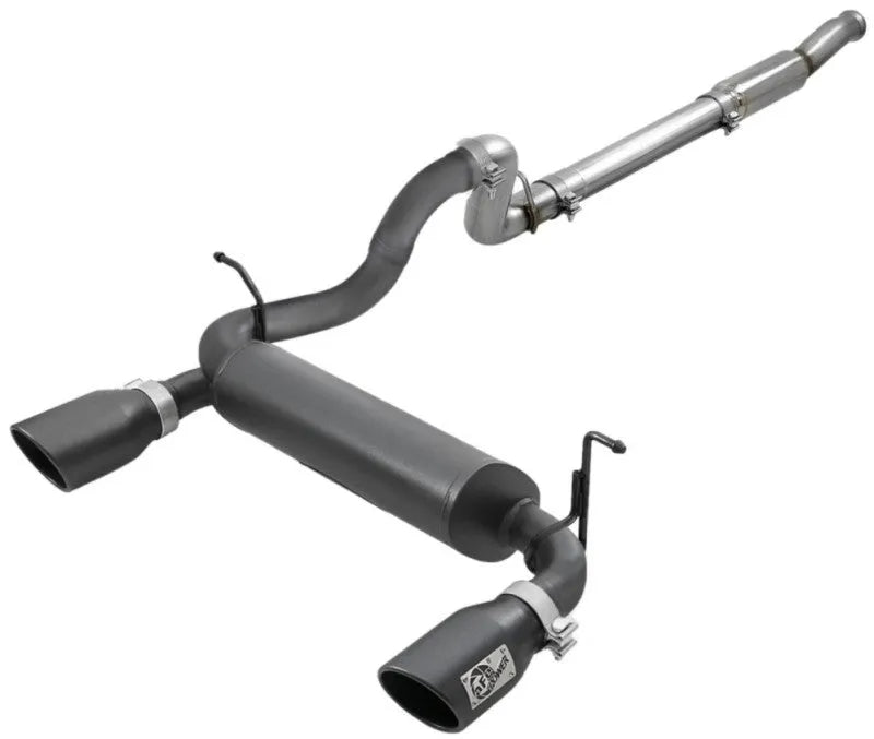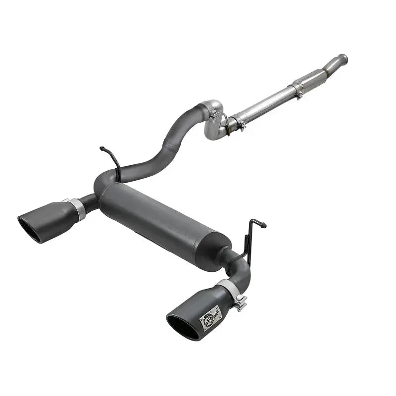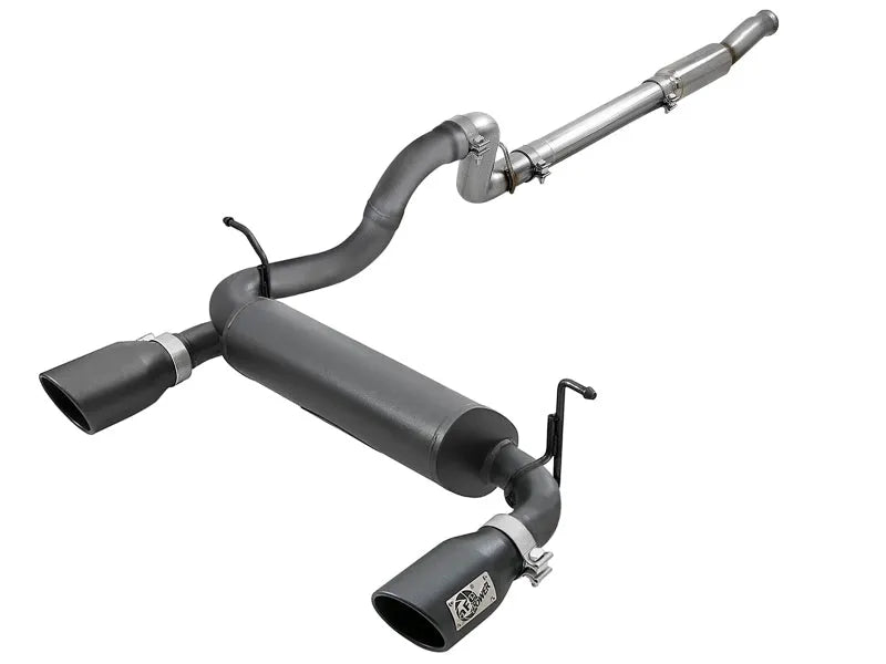 49-48096-B aFe 18-21 Jeep Wrangler 2.0L Cat-Back Exhaust. The aFe Rebel Series Cat-Back Exhaust delivers a throaty sound and enhanced performance with its 3 IN - 2-1/2 IN mandrel-bent 409 stainless steel tubing and high-flow muffler. Featuring dual 4-1/2 IN black stainless steel clamp-on tips with a unique aFe logo plate, it offers a bold look. This direct bolt-on system uses factory-style hangers for easy installation with no cutting required. 100% MIG-welded for durability, it unleashes maximum horsepower and torque for your Jeep Wrangler 2.0L.