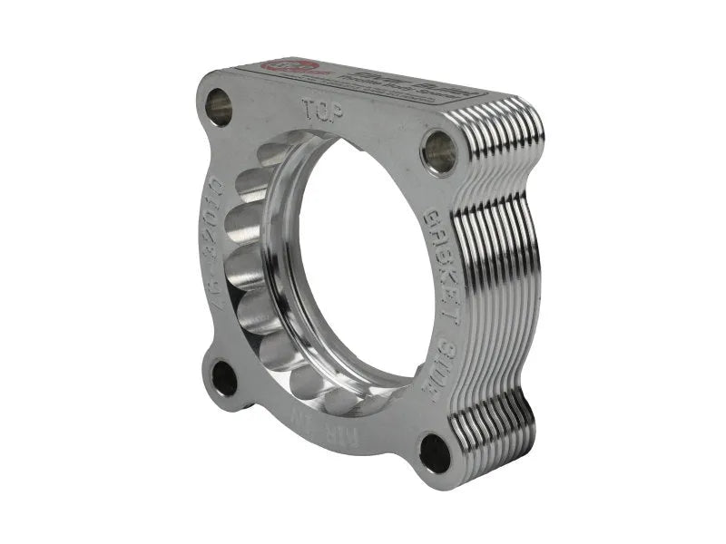 46-32010 aFe 07-12 Dodge Jeep 3.7L Silver Bullet Throttle Body Spacer. Enhance your engine's performance with the Silver Bullet Throttle Body Spacer. Its serrated/helix design creates air turbulence that increases combustion chamber pressure, boosting power and throttle response while reducing intake whistle. Precision machined from lightweight 6061-T6 billet aluminum with a sleek black anodized finish, it ensures durability and a perfect fit. Installation is hassle-free using factory mounting points and includes a gasket for a perfect seal. Experience improved intake air speed and overall engine efficiency with this high-quality spacer.