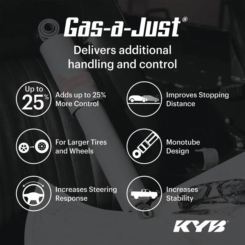 The KYB Gas-A-Just shocks are built with high-quality materials and precision engineering to ensure reliability and durability. Featuring a monotube design, these shocks use high-pressure nitrogen gas to prevent foaming and maintain consistent damping performance under demanding conditions. The robust piston and valving system are calibrated to provide a smooth yet controlled ride, minimizing harshness without sacrificing handling precision.
