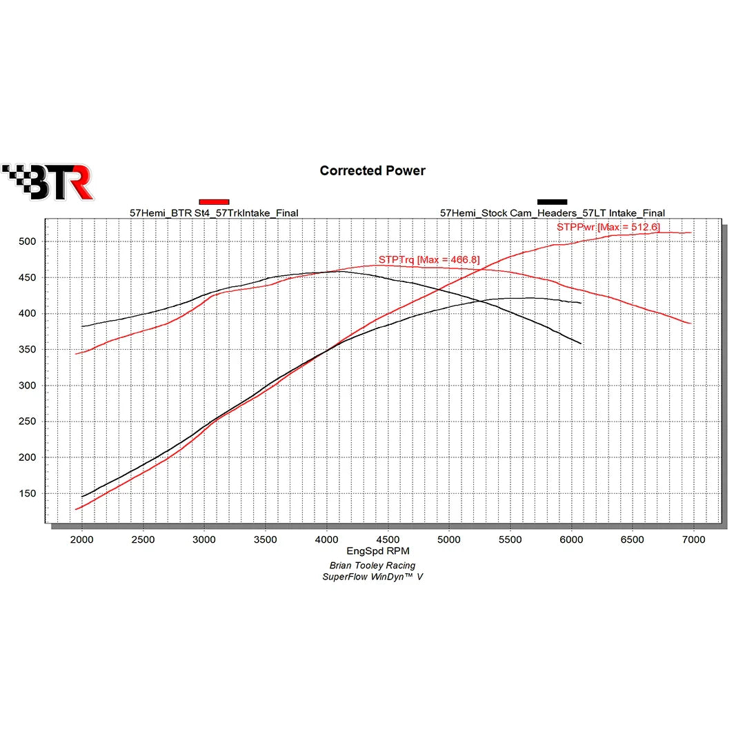 510+ HP at the crank of your 5.7L Hemi is what you can expect with our ‘Stage 4’ camshaft. This ‘Stage 4’ grind provides an additional 1900 RPM of usable operating range while maintaining drivability when paired with an aftermarket Torque Converter. On the BTR Dyno, we observed gains starting at 3800 RPM, with a peak gain of 83 HP and 72 lb/ft at 6000 RPM. The ‘Stage 4’ continues to pull strong past 7100 RPM!