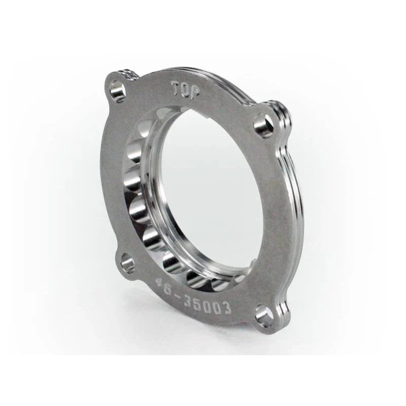 The aFe Silver Bullet Throttle Body Spacer is designed to optimize engine airflow and combustion for 3.6L V6 vehicles. Constructed from lightweight, high-strength T-6061 billet aluminum, this precision-machined spacer features a serrated/helix design that generates turbulence in the intake air. This turbulence enhances the air/fuel mixture, promoting more complete combustion for increased horsepower, torque, and throttle response.
