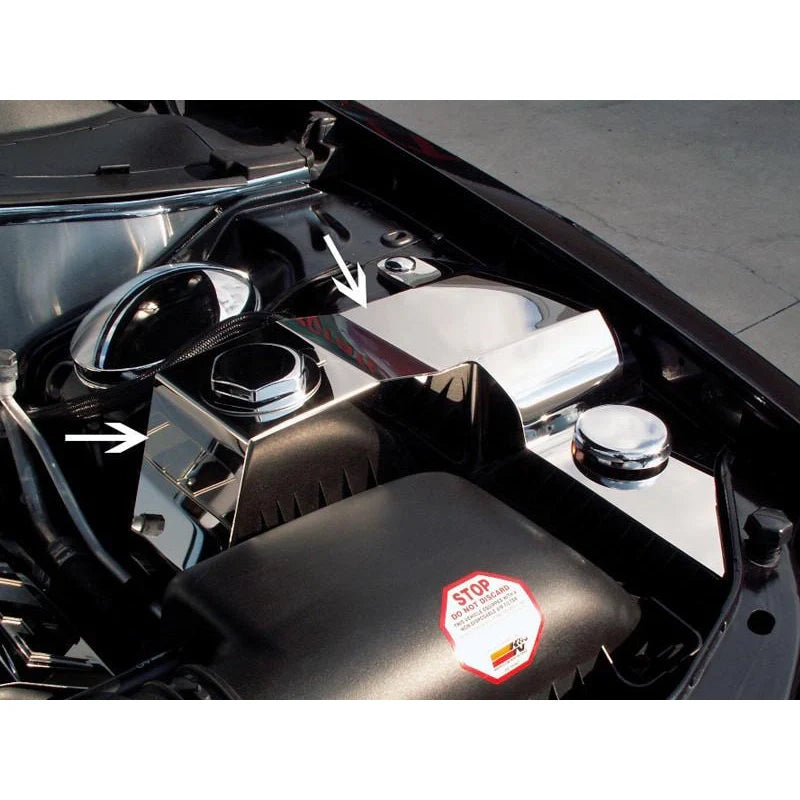 Dress up your vehicle with our Polished Stainless Steel, Water Tank/Power Steering Cover with Chrome cap covers.