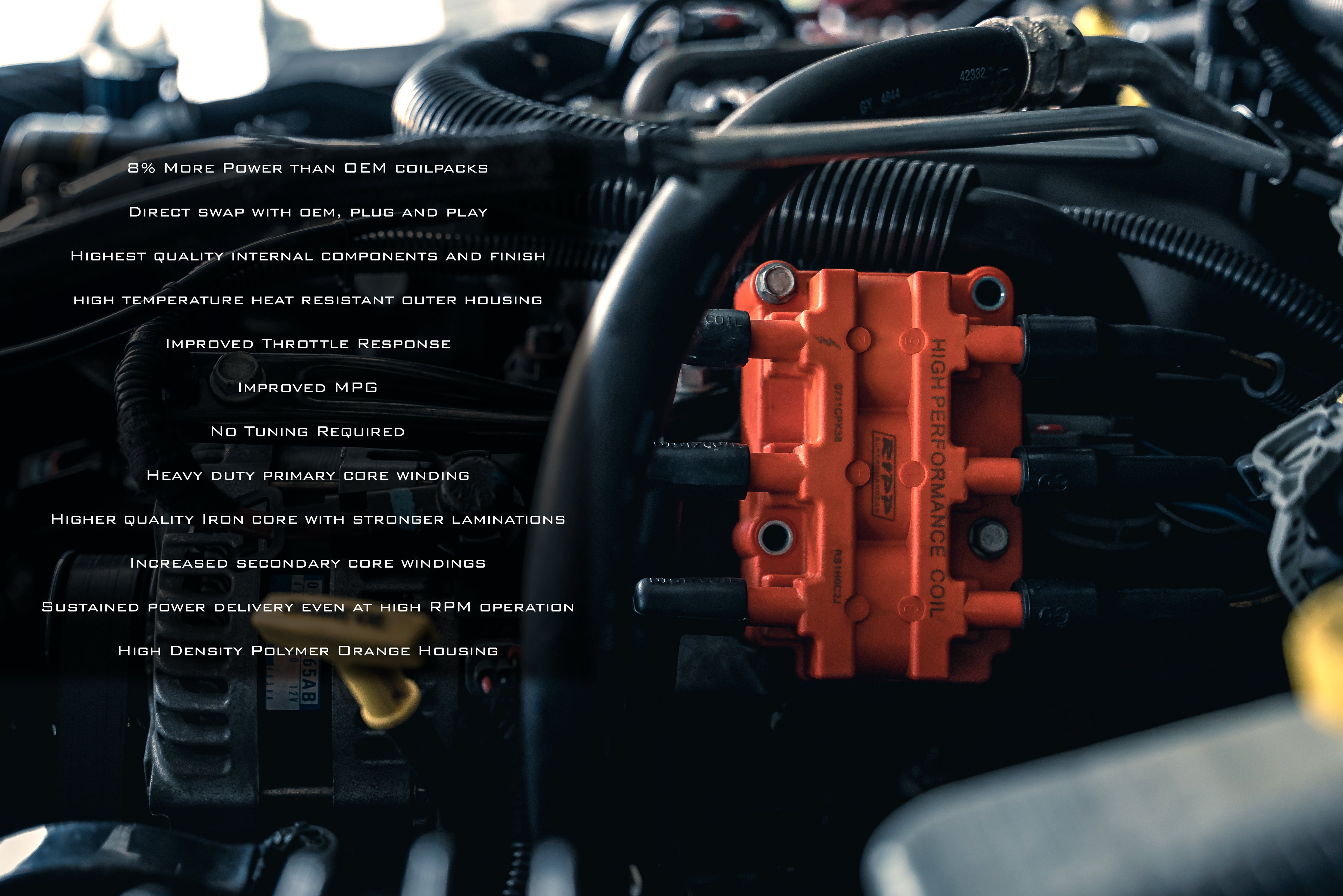 - RIPP Performance Coil Pack: Engineered with increased primary and secondary windings for up to 15% more power at low RPM and 10% more power at redline.