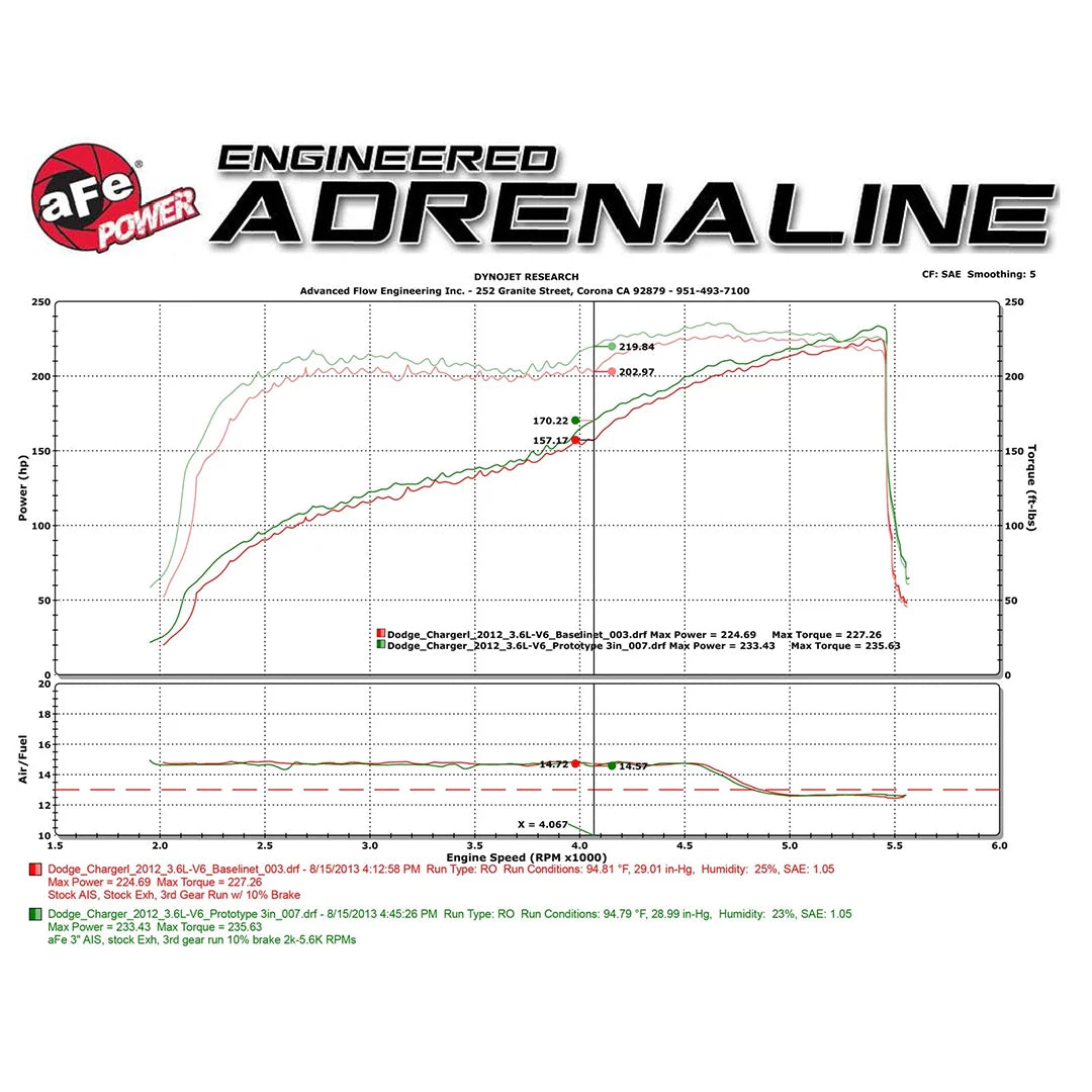 51-12152-B AFE Power 11-24 Chrysler 300C / Dodge Challenger / Dodge Charger 3.6L Cold Air Intake. This cold air intake system produced up to 13 horsepower, 17 lbs. x ft. of torque, and outflowed the factory intake by 37%. Included in this cold air intake system is a 18 gauge powder-coated heat shield and a massive 8" tall, oil-free aFe POWER Pro DRY S filter.