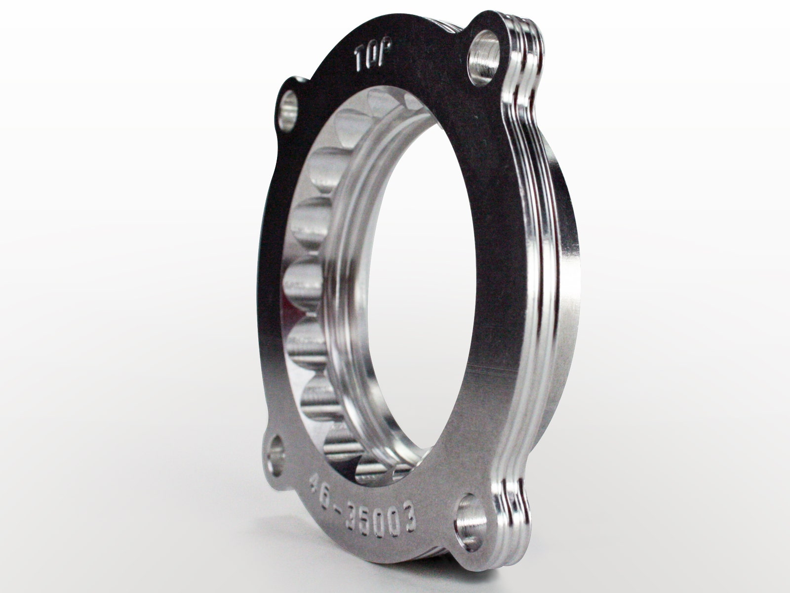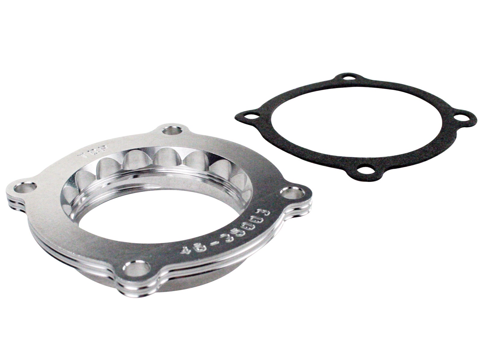 This Silver Bullet throttle body spacer produces 6 hp and 14 lbs. x ft. torque and is constructed from precision machined 6061-T6 billet aluminum and is designed using a serrated/helix design that creates turbulence in the air flow at the point just prior entry into the engine optimizing the combustion cycle. This turbulence helps the air/fuel charge burn completely providing increased horsepower, torque and improved throttle response. This spacer works with the factory and aFe Power cold air intake systems.