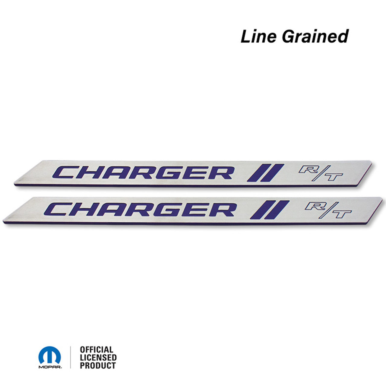 Dodge Charger Front Door Sills are meticulously crafted and MOPAR licensed. Your choice of logo and color combination. These doorsills are made from premium aluminum billet featuring a brushed finish and accented with durable OEM color-matched paint as rich and lustrous as the paint on your vehicle.
