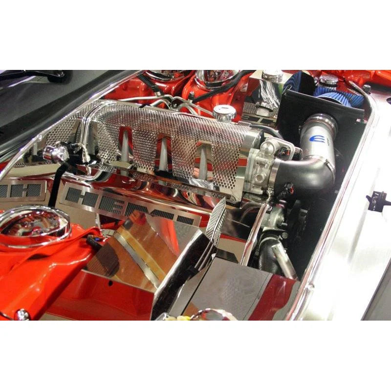 The American Car Craft Illuminated Perforated Plenum Cover is a premium engine bay upgrade designed specifically for 2006 to 2010 Chrysler 300C, Dodge Challenger, Charger, and Magnum SRT8 models equipped with the 6.1L SRT8 engine. This polished stainless steel cover enhances the visual appeal of your engine compartment by replacing the stock intake plenum cover with a sleek, perforated design that can be illuminated for added style and presence.