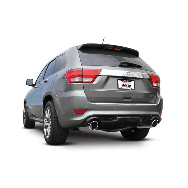11827 Borla 12-14 eep Grand Cherokee 6.4L SRT8 Axle-Back Exhaust ATAK. System features the aggressive ATAK® sound level. ATAK®, Acoustically-Tuned Applied Kinetics, technology is based on specifically-tuned attributes of the internal muffler cores, which are calibrated on a vehicle-by-vehicle basis to deliver the most desirable sound. Even though the sound on the exterior is uncompromising, the sound in the cabin is devoid of harsh resonance, a product of painstaking engineering and over 40 years of experience.