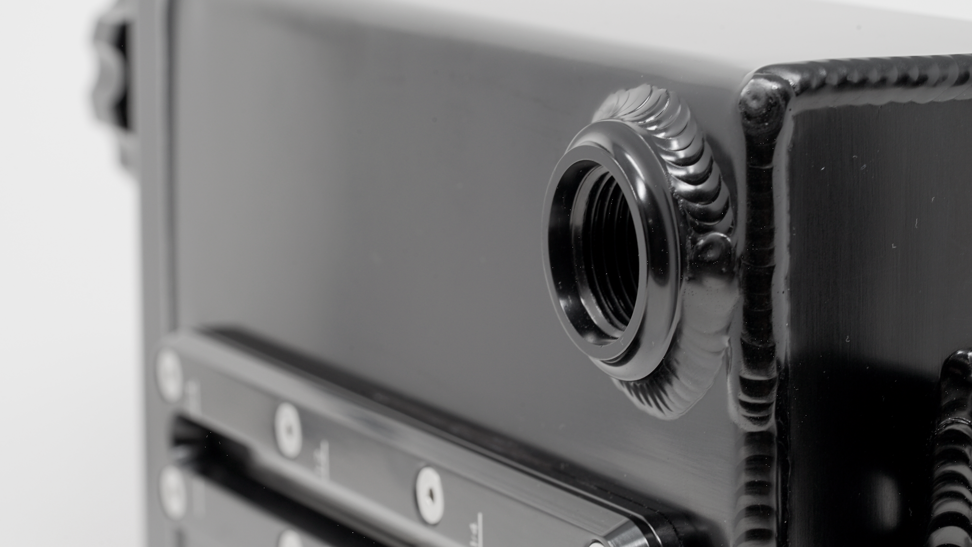 - Billet aluminum coolant expansion tank with durable satin black powder coat finish