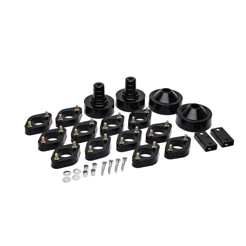 The body lift components are constructed from robust materials with a black powder-coated finish that resists rust and corrosion. This combination of materials and finishes guarantees that the lift kit maintains its structural integrity and appearance over time, even under harsh environmental conditions.