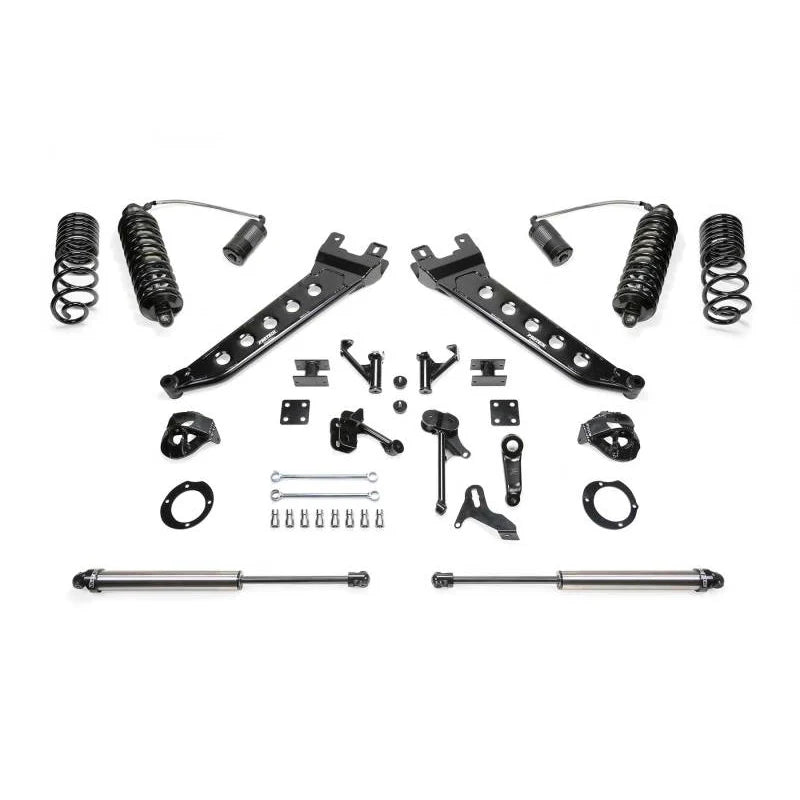 The Fabtech Radius Arm Kit is engineered specifically for 2014 to 2018 Ram 2500 models, delivering a robust 5-inch suspension lift designed to enhance off-road capability and on-road comfort. This kit integrates seamlessly with the factory upper coil bucket, reinforced with support gussets for exceptional strength and durability. Featuring Dirt Logic 4.0 Coilovers with remote reservoirs, it provides superior damping performance for both highway cruising and rugged terrain. Ideal for Ram 2500 owners seeking a reliable, high-performance suspension upgrade that supports larger tires and aggressive wheel setups.