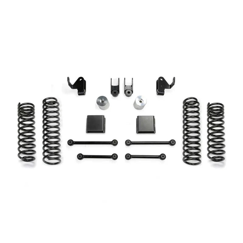 K4162 Fabtech Jeep Gladiator 2020 w/ Shock Ext 3in Sport II Gas Suspension System. The Fabtech 3in Sport II Gas Suspension System enhances ride height and suspension performance for 2020 Jeep Gladiator 6-cylinder models. Featuring American-made dual-rate coil springs, it delivers extended off-road travel while maintaining a smooth highway ride. The system includes extended sway bar links and bump stop brackets to preserve factory suspension dynamics. Ideal for Jeep enthusiasts seeking improved off-road capability and the ability to run larger tires without sacrificing daily drivability.