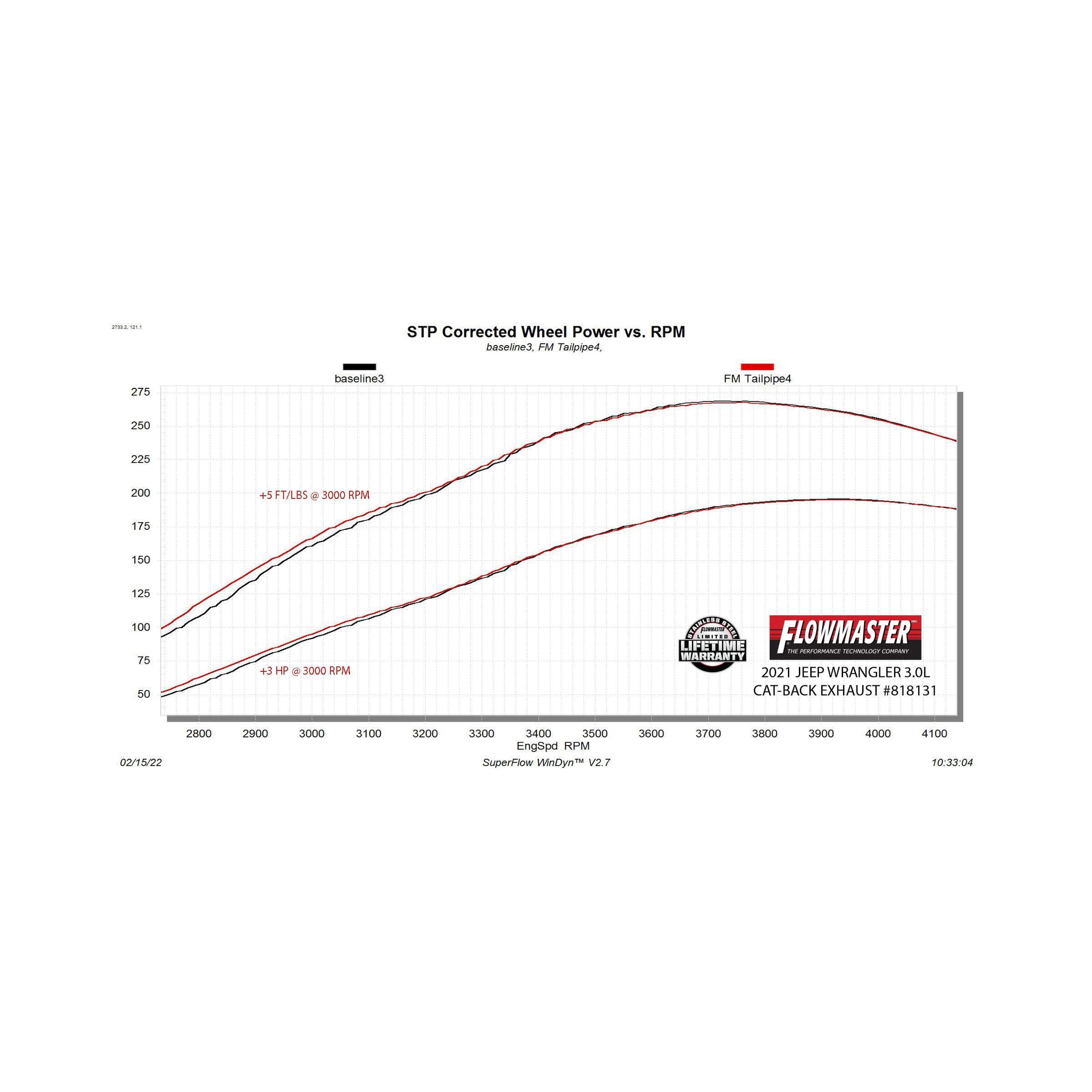 By removing the restrictive factory muffler and utilizing larger diameter piping, the Flowmaster American Thunder system enhances exhaust flow, resulting in measurable performance gains. Dyno testing shows an increase of up to 3 horsepower and 5 lb-ft of torque at the rear wheels, translating to improved throttle response and overall engine efficiency.