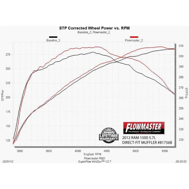 817568 Flowmaster 09-18 Dodge Ram 5.7L Hemi 1500 & Ram 5.7L Hemi 1500 American Thunder Direct Fit Muffler. Enhance your vehicle’s exhaust with the Flowmaster American Thunder Direct-Fit Muffler. Constructed from stainless steel with a 50 Series HD™ muffler and built-in resonator, it delivers a deep, moderate-aggressive exterior tone while minimizing cabin noise. Direct-fit design uses factory hanger locations for quick, bolt-on installation and includes all hardware and instructions, backed by a lifetime warranty.