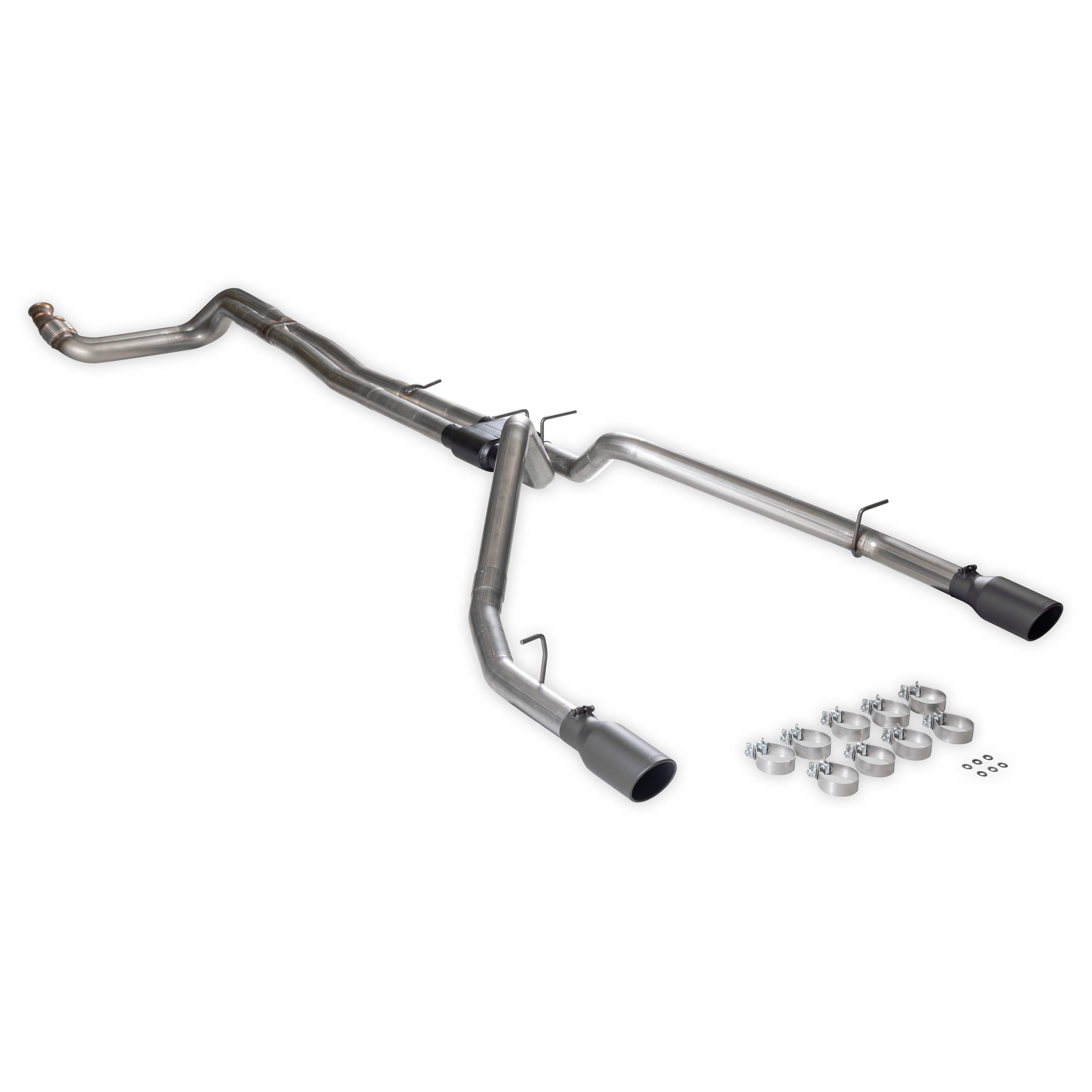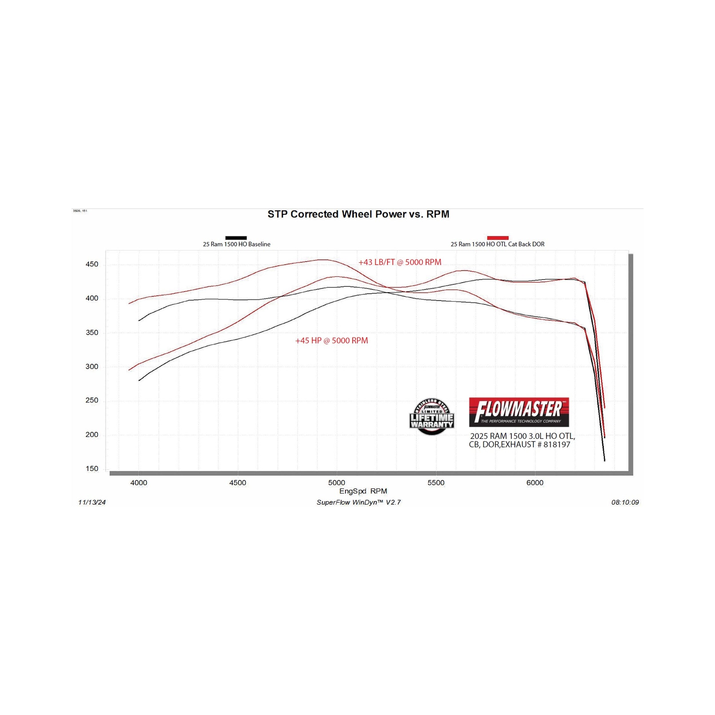 818197 Flowmaster 25-26 Ram 1500 Outlaw Cat-Back Exhaust System. Flowmaster's Outlaw Cat-Back Exhaust System delivers aggressive sound and enhanced performance for 2025-2026 Ram 1500 3.0L Standard and High Output models. Crafted from durable 409 stainless steel, it features dual 3-inch pipes, a custom tuned muffler, and exclusive Scavenger X-Pipe with D-Port technology for maximum exhaust pulse velocity. This true dual exhaust system boosts power by up to 45 hp and 43 lb-ft, fits factory hangers for easy installation, and includes black ceramic coated tips for a sleek finish. Backed by a lifetime limited warranty.