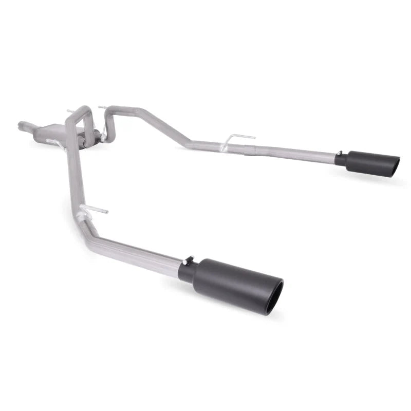 66569B Gibson Ram 1500 2014-2017 Black Elite Cat-Back Dual Split Exhaust. The Gibson Black Elite Cat-Back Dual Split Exhaust enhances performance and style for Ram 1500 models from 2014 to 2017. Featuring T-304 stainless steel with a black ceramic finish, it delivers a rich, deeper tone through the Superflow stainless steel muffler while minimizing interior drone. Designed for durability and improved airflow, this system offers a bold look with rolled slash-cut tips and supports increased performance without sacrificing comfort. Perfect for Ram 1500 owners seeking a quality, aggressive exhaust upgrade.