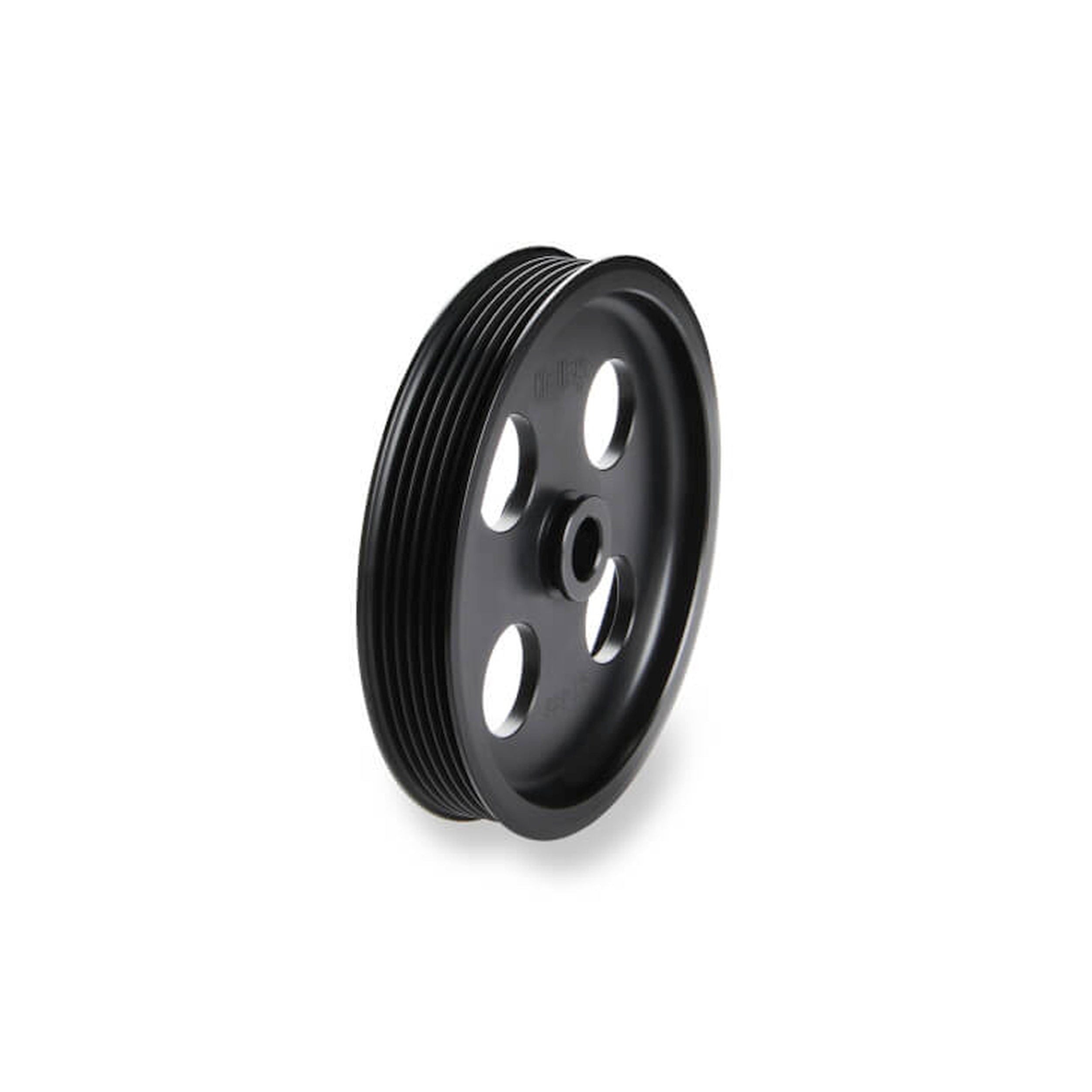 - 6-rib billet aluminum pulley with a durable black anodized finish for corrosion resistance and long-lasting appearance