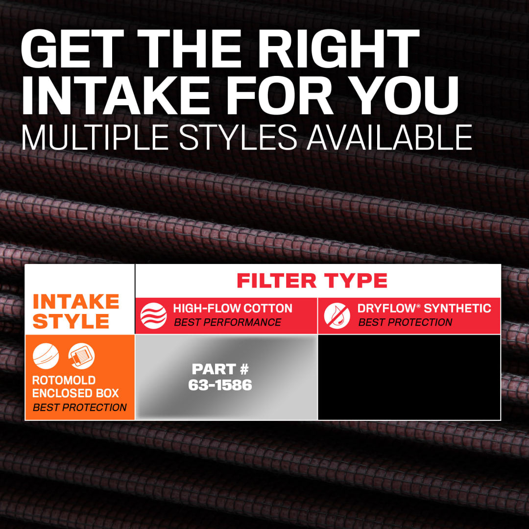 A high-density polyethylene (HDPE) rotationally-molded tube helps increase the volume of airflow to your engine, and provides a guaranteed increase in horsepower and torque. These systems are paired with a washable, reusable High-Flow Air Filterâ„¢ featuring oiled cotton filter media. The oversized, conical design allows you to go up to 100,000 miles between filter services under normal highway driving conditions. A custom heat shield helps protect intake air from the high temperature of your engine bay, and the entire system can typically be installed in less than 60 minutes.