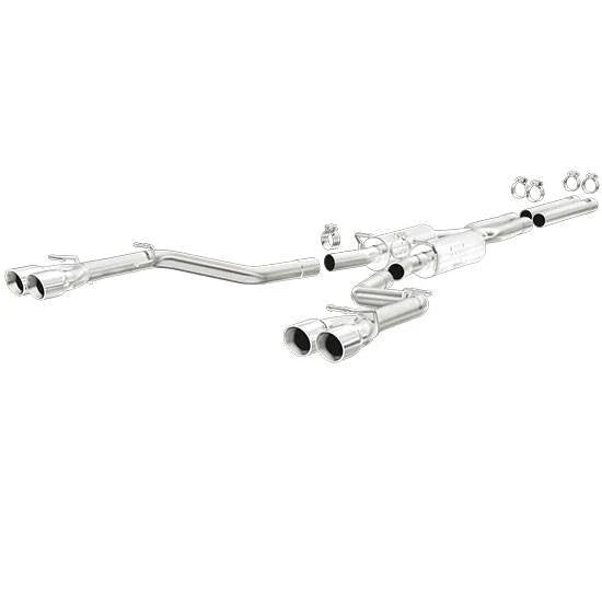The MagnaFlow Street Series Cat-Back Exhaust is engineered for performance, sound, and reliability. Constructed from durable 2.5" mandrel-bent stainless steel tubing, it includes straight-through mufflers and a resonator for a smooth, deep tone while improving exhaust flow and engine performance. The system offers dual or quad split rear exits with polished stainless steel tips to suit different aesthetic preferences. Designed as a direct-fit replacement, it installs easily using OEM-style hangers and includes all necessary hardware. Dyno-tested for verified gains in horsepower and torque, this system produces moderate exterior and mild interior sound levels, giving your vehicle a commanding presence. Manufactured with precision and backed by MagnaFlow’s lifetime warranty, it delivers lasting quality and performance.
