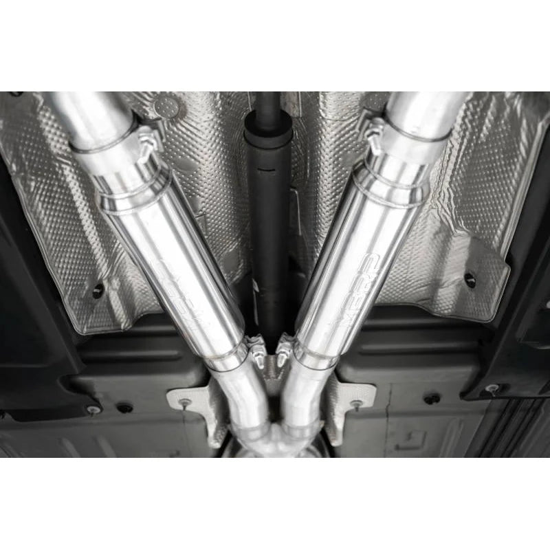 - Dual split rear with polished T304 stainless steel single-wall tips for a classic finish