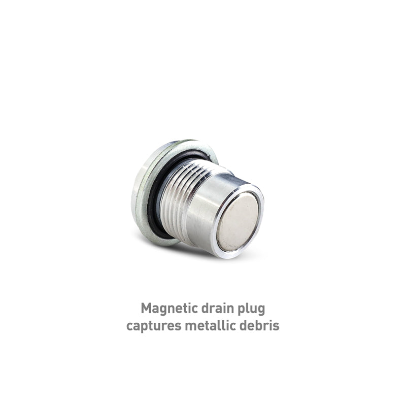 - Magnetic drain plug captures metal debris, protecting transmission components and easing fluid changes