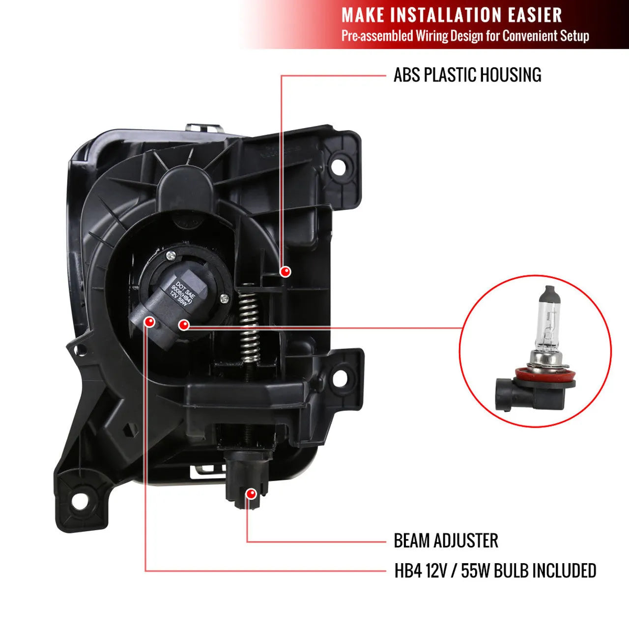 These fog lights are designed for direct replacement on 2013–2018 Dodge Ram 1500 models, excluding Rebel trims. The kit includes a pre-assembled wiring harness, relay, and an on/off switch, allowing for straightforward installation without the need for extensive modifications. While the installation process is user-friendly for those with basic automotive electrical knowledge, professional installation is recommended to ensure proper fitment and electrical safety. This helps maintain vehicle integrity and guarantees optimal fog light performance.