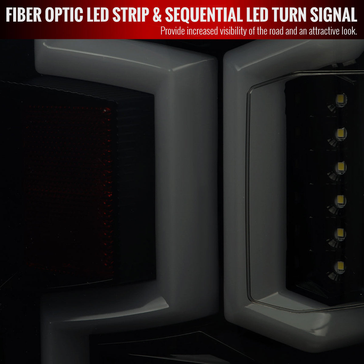 LT-RAM1925BBLD-SQ-TM Spec D 19-24 Ram 2500 & 3500 LED Tail Lights (Dark Smoke w/ Sequential Turn Signal). Comes with (1) set of sequential LED turn signal tail lights in glossy black housing with dark smoke lens. Fiber optic, dynamic LED strip/bar & brake lights.