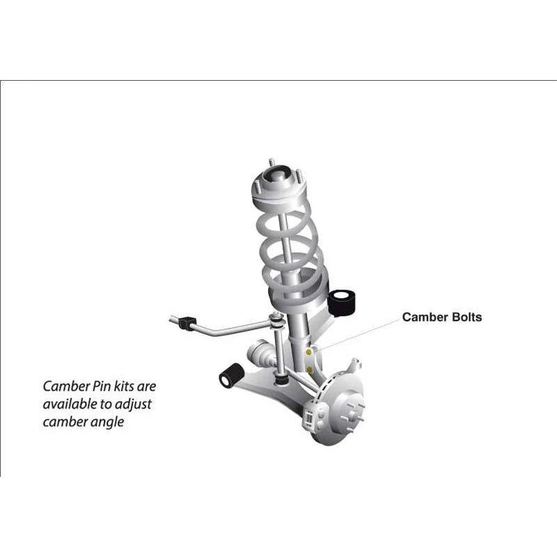 Installation of the Whiteline Front Camber Kit is straightforward and can be completed with basic hand tools. The kit replaces the factory front camber bolts, allowing for easy adjustment of the camber angle by rotating the bolts to the desired position. No special modifications or suspension disassembly beyond standard removal of the existing bolts are required.