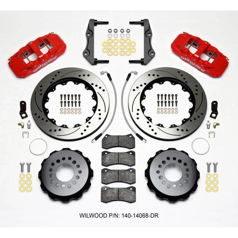 140-14068-DR Wilwood 12-23 Chrysler 300 / Dodge Challenger / Dodge Charger Rear Big Brake Kit. Wilwood AERO4 Rear Big Brake Kit features 4-piston red powder-coated calipers and drilled 14.25" rotors designed for enhanced braking performance and durability. This kit replaces factory rear discs while retaining the OE parking brake assembly, ensuring compatibility with ABS and master cylinder output. Ideal for high-performance street and track use, it offers improved stopping power, heat dissipation, and a stylish upgrade for vehicles with larger wheels and tires. Requires minimum 18" wheels for fitment.