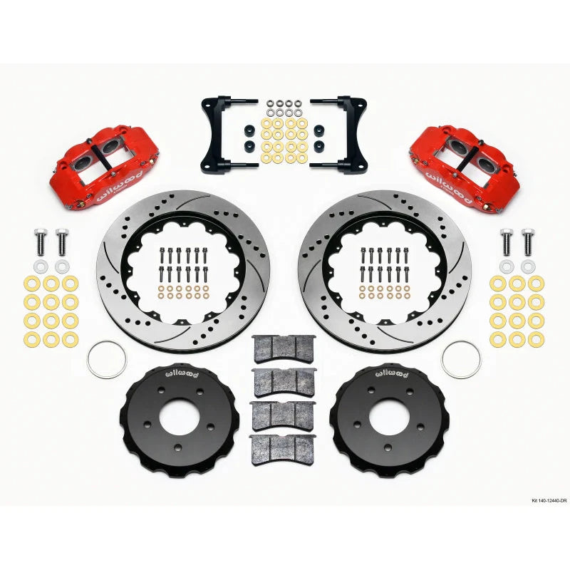 140-12440-DR Wilwood 07-18 Jeep Wrangler Front Big Brake Kit. Upgrade your Jeep Wrangler JK with Wilwood’s Narrow Superlite 4-piston front big brake kit featuring red powder-coated calipers and drilled 14-inch rotors for superior heat dissipation and fade resistance. Designed for direct bolt-on installation, it maintains ABS and master cylinder compatibility. This kit delivers enhanced stopping power, reduced unsprung weight, and a race-inspired look, perfect for street, trail, or light off-road use. Requires 18-inch wheels for clearance and includes high-performance pads for immediate track-ready braking.